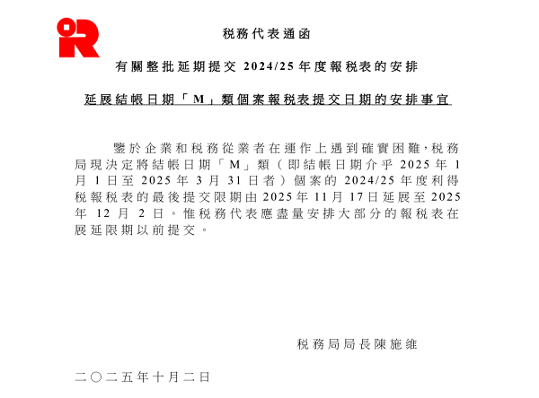 香港稅務(wù)局于2025年10月2日發(fā)布最新通告,為緩解企業(yè)年底申報(bào)壓力,正式延長結(jié)賬日期「M」類公司(即財(cái)政年度結(jié)賬日期在2025年1月1日至3月31日之間)的2024/25年度利得稅申報(bào)期限——由原定的2025年11月17日延后兩周至2025年12月2日。本次延期旨在為企業(yè)提供更多準(zhǔn)備時(shí)間,但需注意12月2日為最終截止日,逾期將面臨合規(guī)風(fēng)險(xiǎn)。