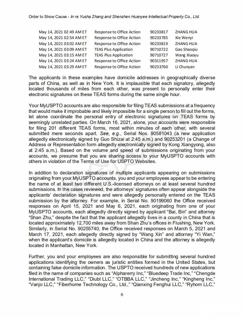 2021年6月8日,美國專利商標(biāo)局(USPTO)向中國深圳一家知識產(chǎn)權(quán)公司的代表人發(fā)出一份123頁的“ORDER TO SHOW CAUSE”。對該公司代理提交的批量美國商標(biāo)的行為,尤其是其中涉及到第三方簽名提供虛假、虛構(gòu)和欺詐信息的行為提出質(zhì)疑,要求該公司提出合理的理由,并在美國東部時間6月22日下午5:00前進(jìn)行回復(fù)。否則USPTO將會對該代理機(jī)構(gòu)以及代表人進(jìn)行制裁。