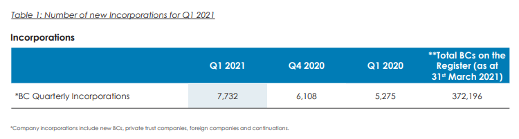 從統(tǒng)計(jì)數(shù)據(jù)看,BVI公司在2021 年第一季度設(shè)立公司7,732家,較2020年下半年的數(shù)字上升26.59%。截至3月31日,在BVI設(shè)立的公司總數(shù)達(dá)到了372,196家。