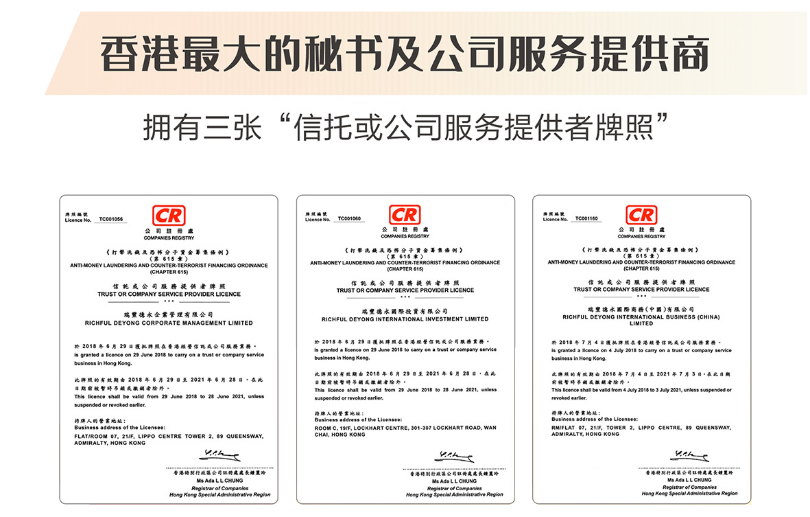 瑞豐德永是亞洲具有領(lǐng)先地位的專業(yè)服務(wù)機(jī)構(gòu),是香港最大的秘書及公司服務(wù)提供商,擁有三張“信托或公司服務(wù)提供者牌照”。