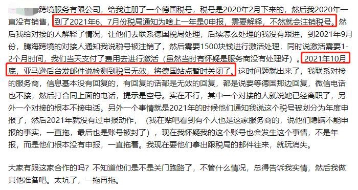 有賣(mài)家反映,去年在某家跨境服務(wù)公司辦理VAT業(yè)務(wù),從今年開(kāi)始事情就開(kāi)始不對(duì)勁,相關(guān)問(wèn)題交錢(qián)后業(yè)務(wù)也處于停滯狀態(tài),業(yè)務(wù)人員既不回消息,也沒(méi)有任何通知,最后導(dǎo)致稅號(hào)檢測(cè)無(wú)效,站點(diǎn)被關(guān)閉!