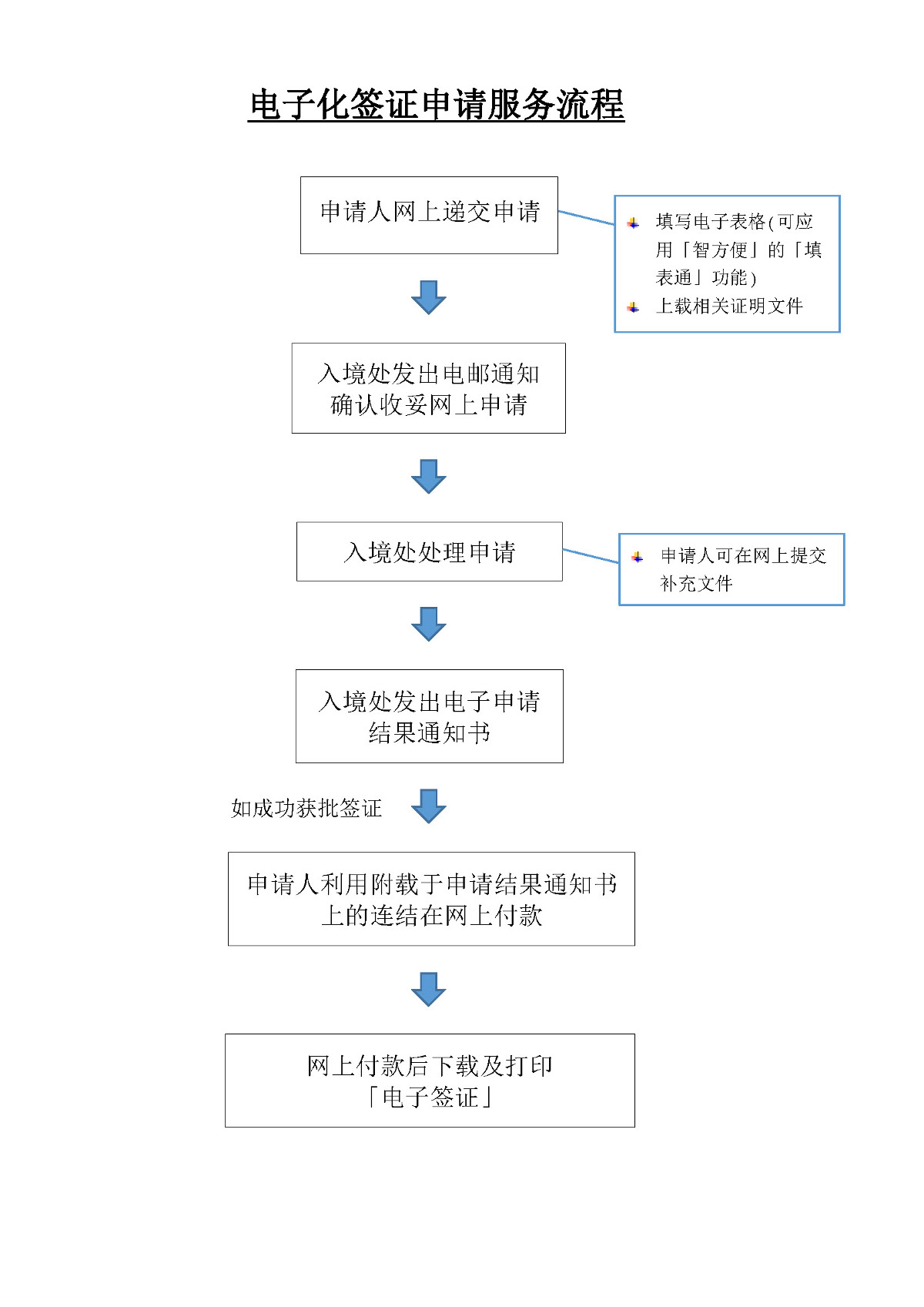 符合條件的申請(qǐng)人無需親身前往入境處辦事處,而可在網(wǎng)上完成整個(gè)申請(qǐng)程序,包括通過入境處流動(dòng)應(yīng)用程序、入境處網(wǎng)站或香港政府一站通網(wǎng)站遞交簽證,于申請(qǐng)獲批后通過網(wǎng)上付款程序繳納相關(guān)費(fèi)用,并在繳費(fèi)成功后即時(shí)下載“電子簽證”,以PDF形式儲(chǔ)存于個(gè)人流動(dòng)設(shè)備中或進(jìn)行打印。