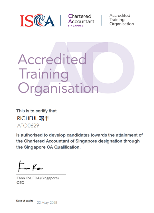 近期,RICHFUL瑞豐通過新加坡特許會計(jì)師協(xié)會(The Institute of Singapore Chartered Accountants, ISCA)審核,正式獲得“認(rèn)證培訓(xùn)雇主”(Accredited Training Organisation, ATO) 資格。該資質(zhì)表明RICHFUL瑞豐在會計(jì)人才培養(yǎng)體系及專業(yè)實(shí)踐機(jī)制上符合ISCA國際標(biāo)準(zhǔn),為企業(yè)深化國際化人才戰(zhàn)略奠定基礎(chǔ)。