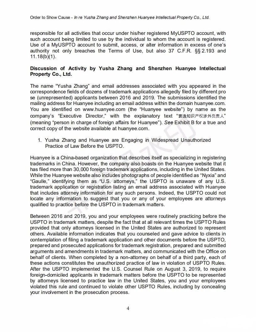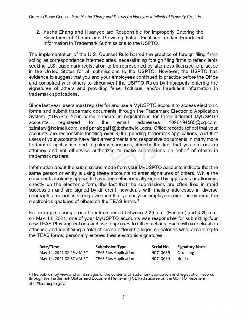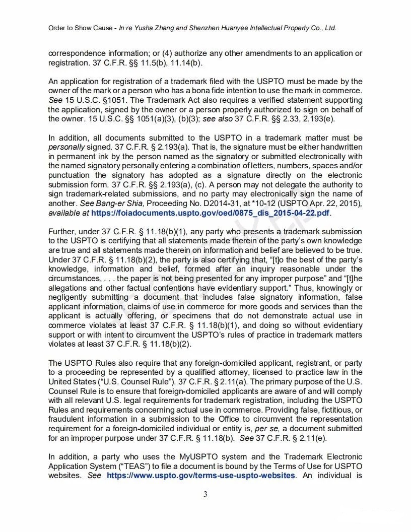 2021年6月8日,美國專利商標(biāo)局(USPTO)向中國深圳一家知識產(chǎn)權(quán)公司的代表人發(fā)出一份123頁的“ORDER TO SHOW CAUSE”。對該公司代理提交的批量美國商標(biāo)的行為,尤其是其中涉及到第三方簽名提供虛假、虛構(gòu)和欺詐信息的行為提出質(zhì)疑,要求該公司提出合理的理由,并在美國東部時間6月22日下午5:00前進(jìn)行回復(fù)。否則USPTO將會對該代理機(jī)構(gòu)以及代表人進(jìn)行制裁。